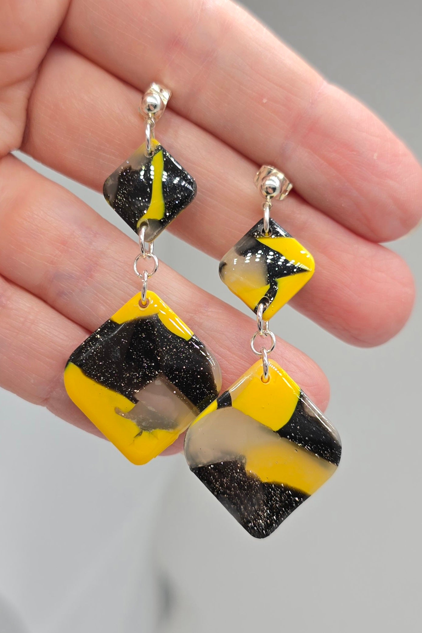 These gorgeous earrings have the appearance of Bumblebee Jasper with sparkly black and yellow. Earrings are on hypoallergenic silver-plated hooks with a rubber backing. Earrings are made of polymer clay and resin.