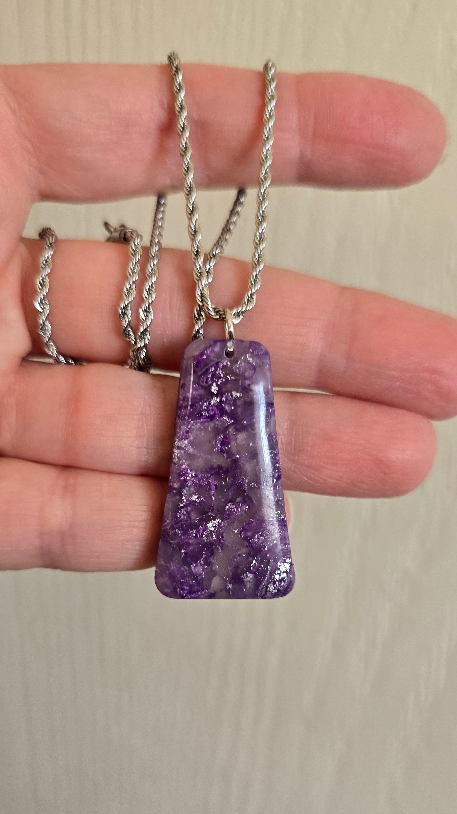 Beautiful faux stone amethyst necklace pendant. Shades of purple with some transparency and silver. The pendant is made with polymer clay and resin. Pendant is approximately 1.5" H x 1" W.