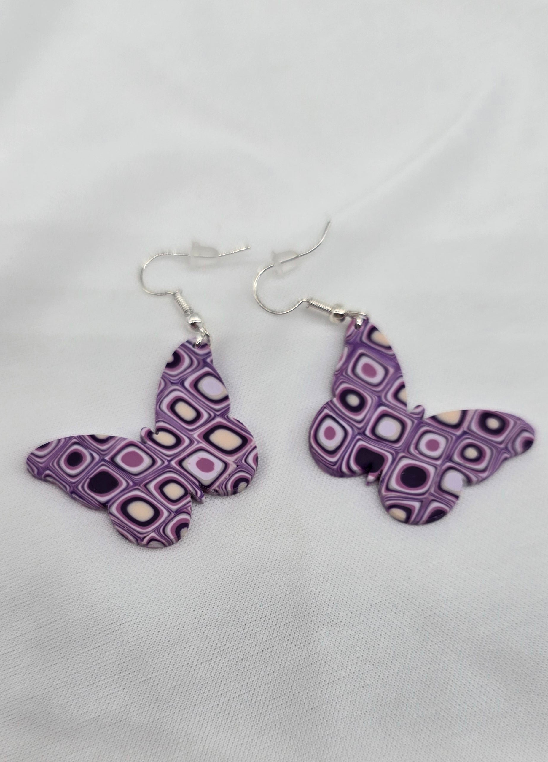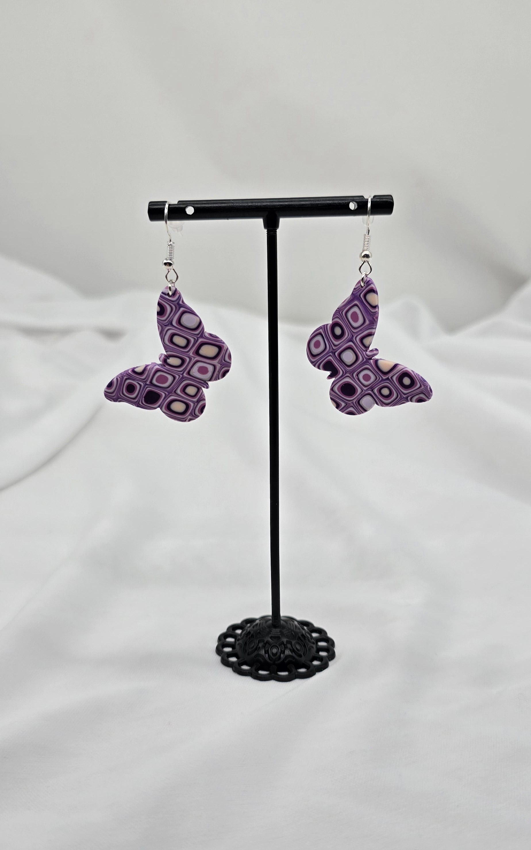 These lovely purple butterfly dangles have circles of cream, white, purple, and black. These come on hypoallergenic silver-colored hooks with a rubber backing. Earrings are made of polymer clay.