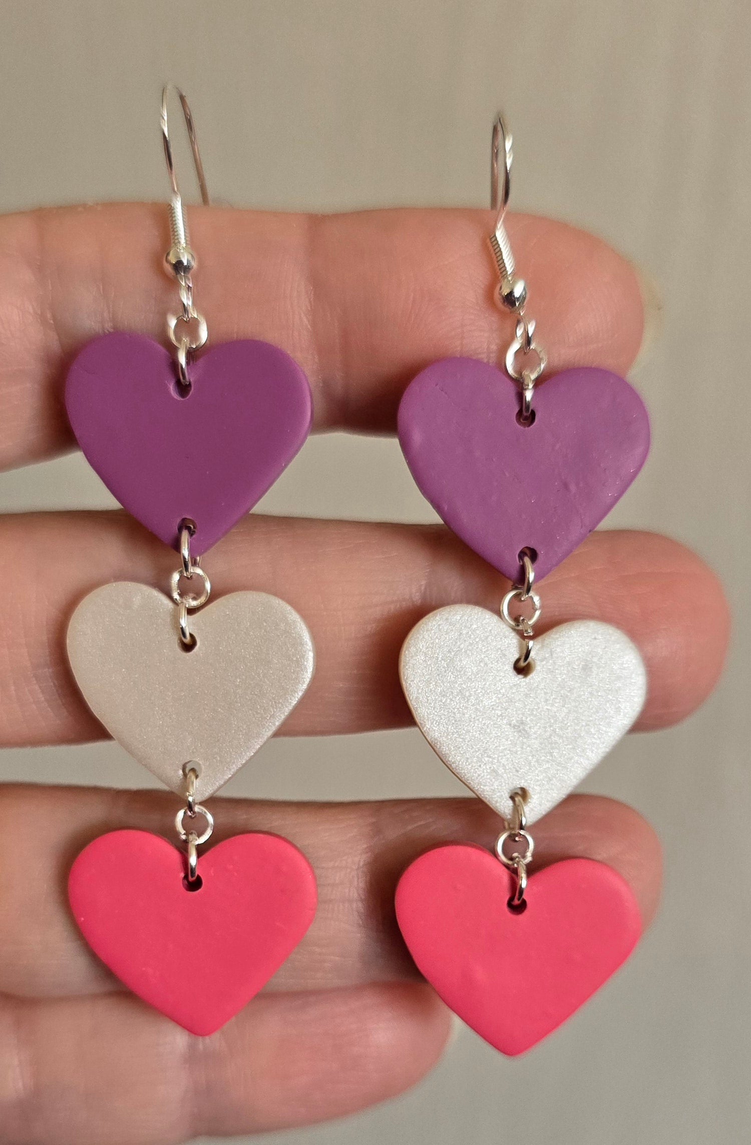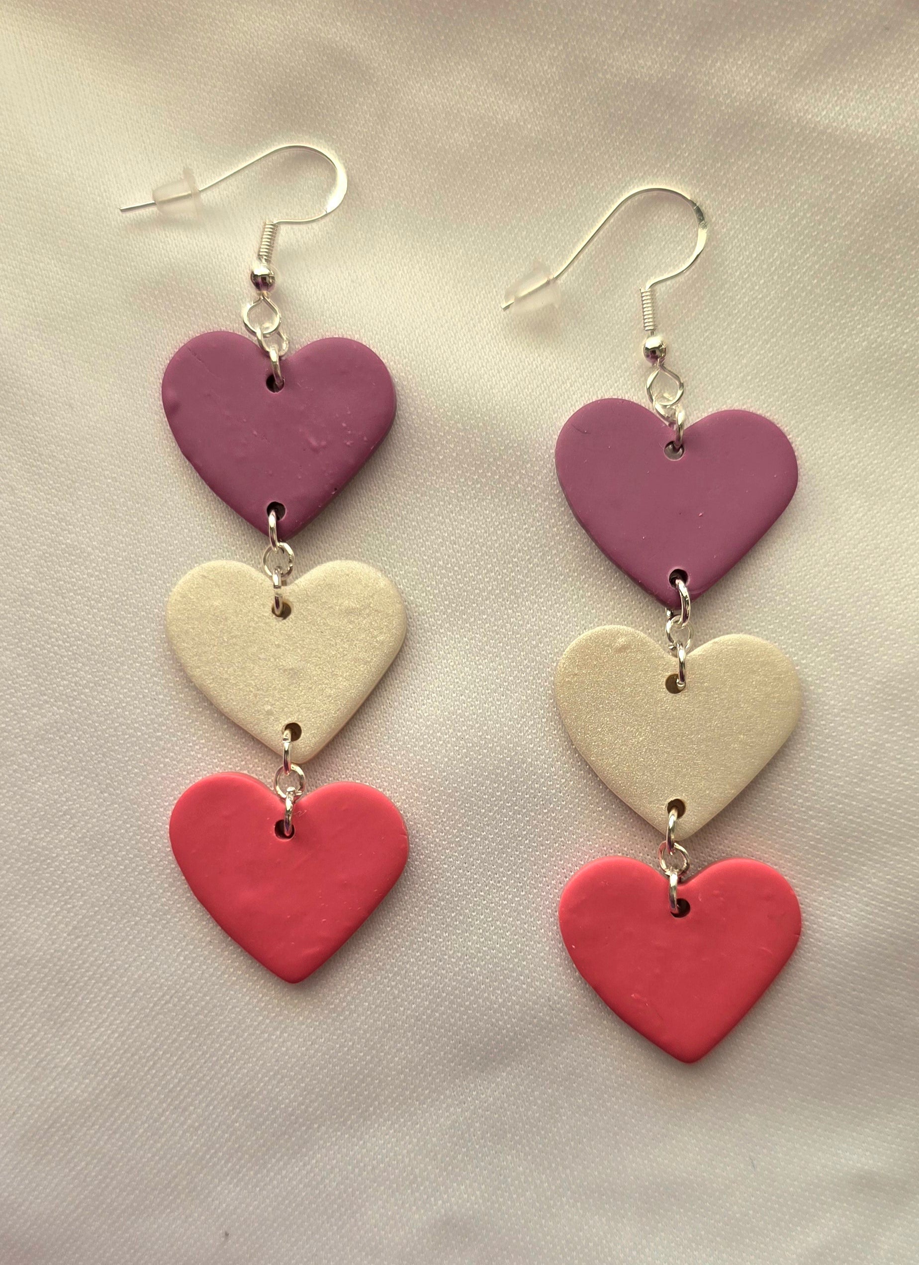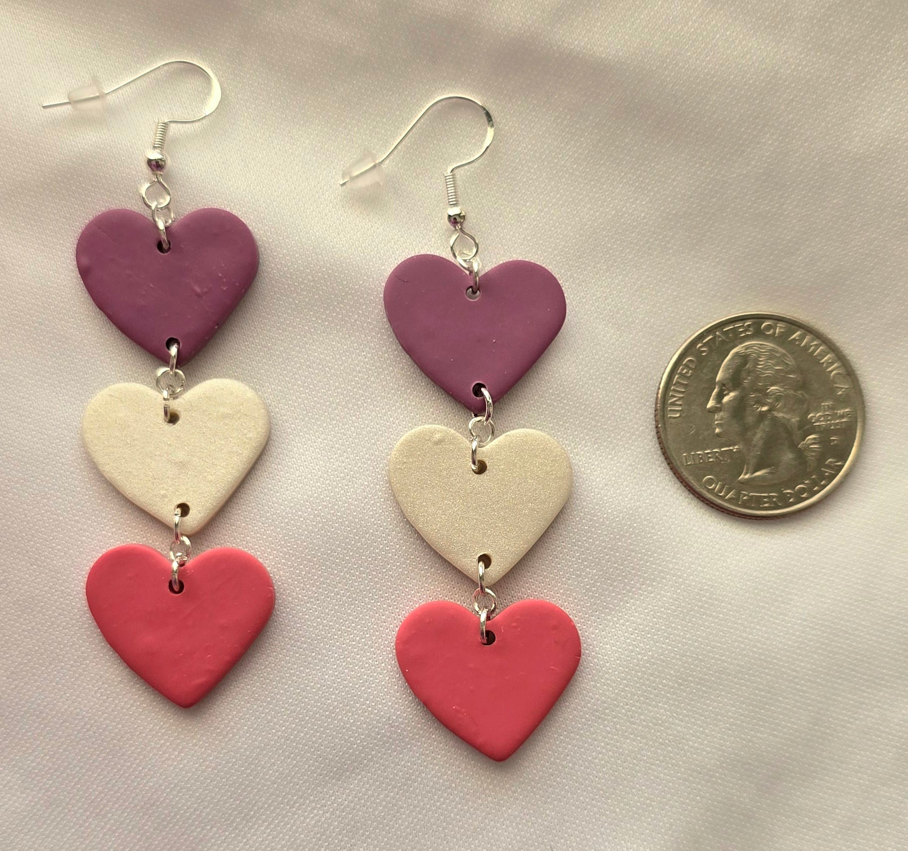 Three heart dangle design with purple, pearl, and pink hearts. These come on sterling silver plated hypoallergenic hooks with a rubber backing. Earrings are made of polymer clay.
