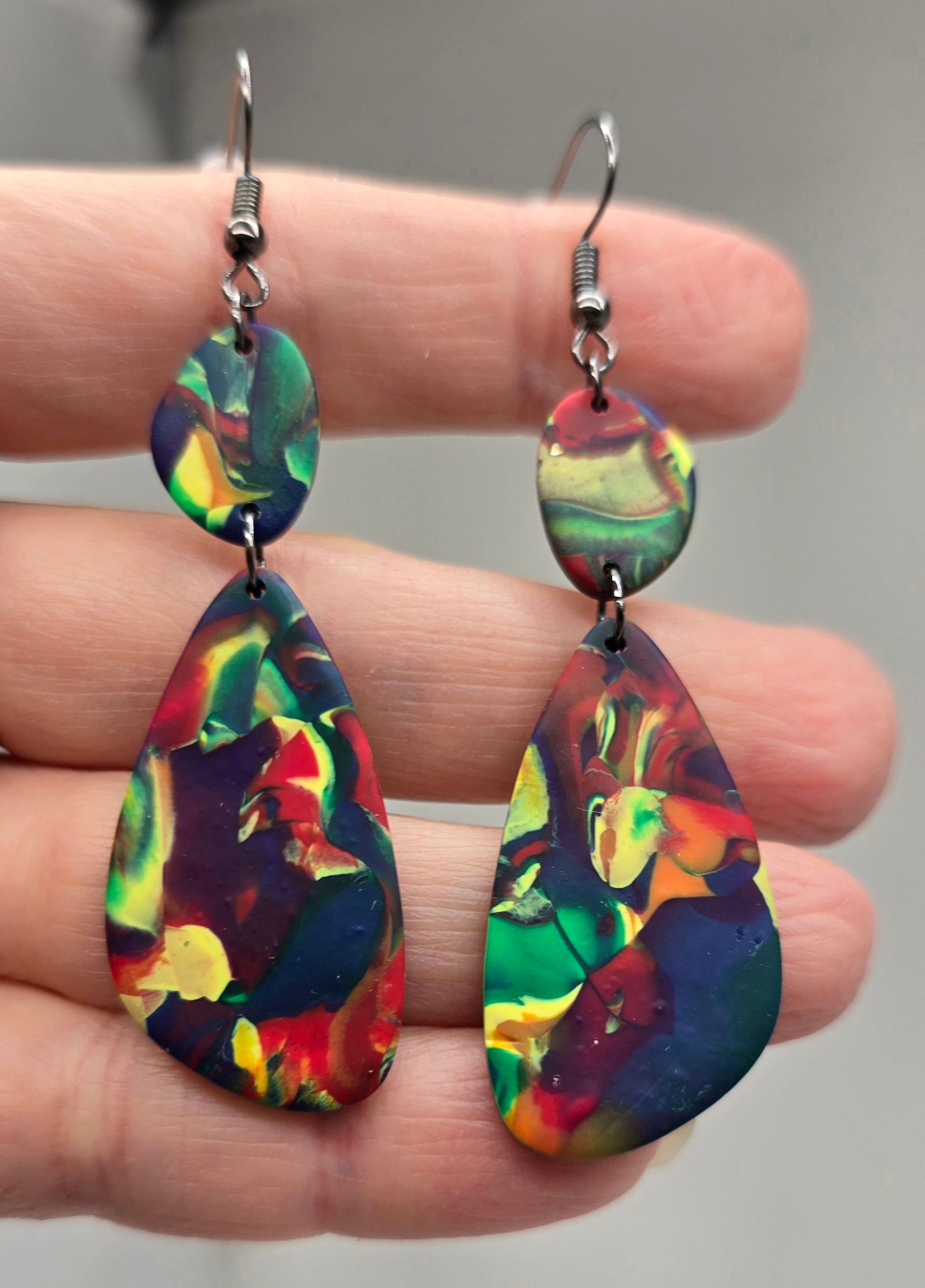 Brightly colored rainbow earrings. Hypoallergenic gold-colored hooks with a rubber backing. Earrings are made of polymer clay.
