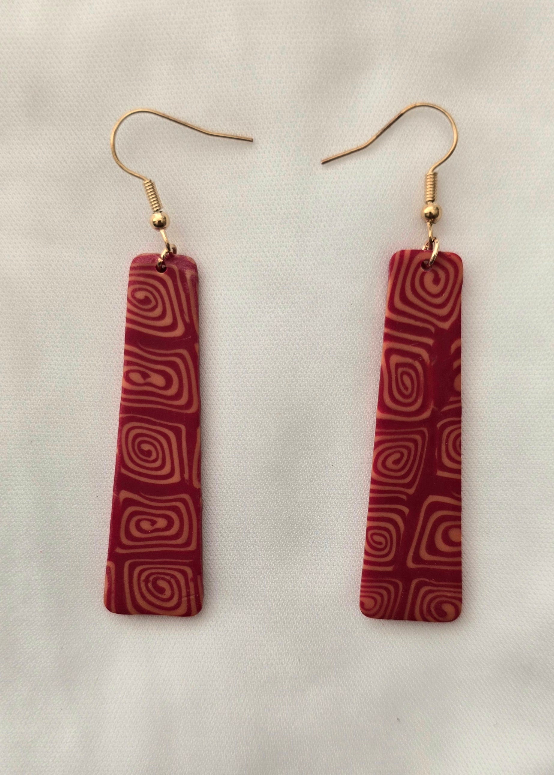 These earrings have a red base color with square designs of gold. They are on hypoallergenic gold-colored hooks and come with a rubber back. Earrings are made of polymer clay.