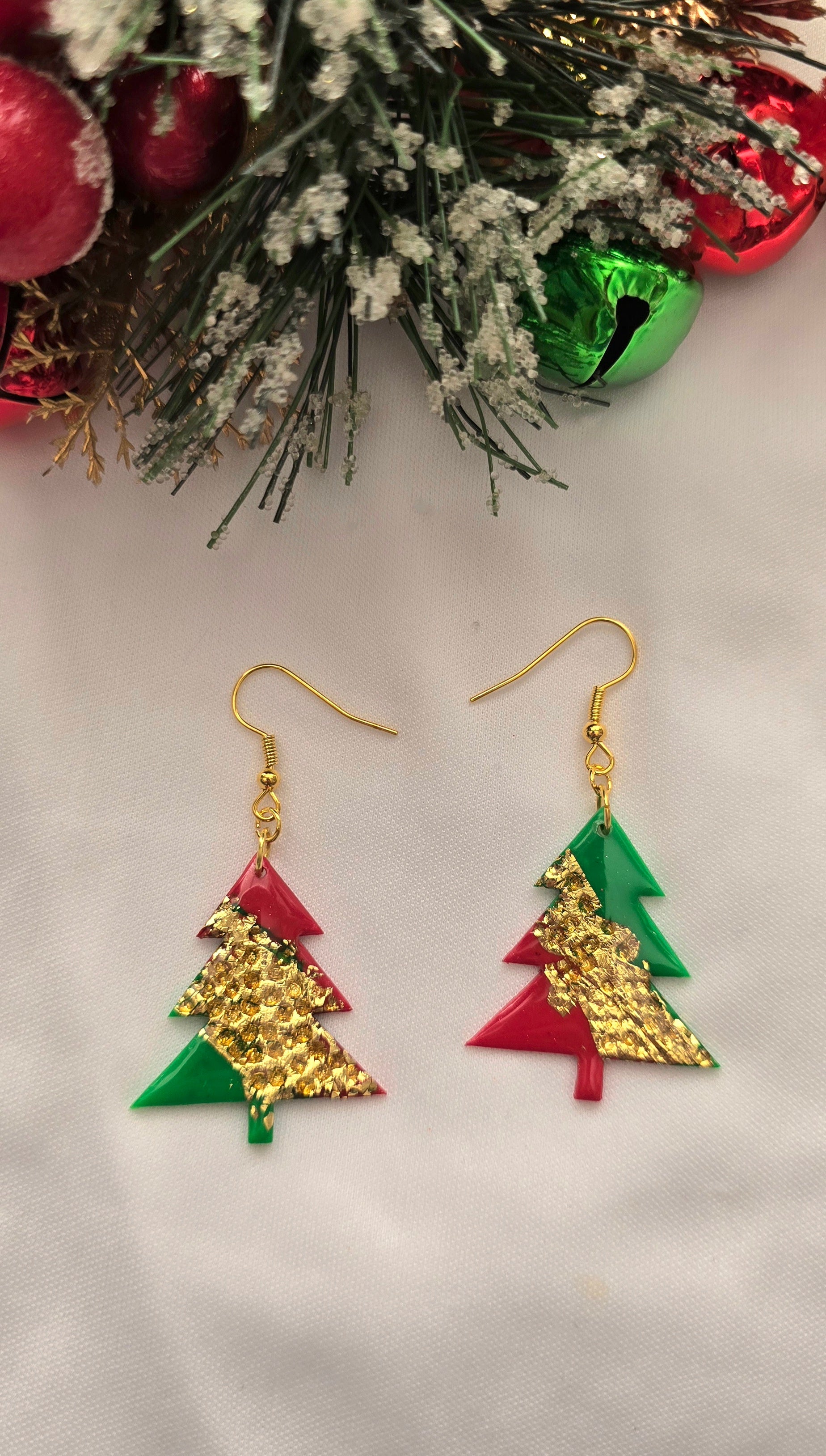 Red and green earrings Christmas trees with a gold foil pattern. These come on hypoallergenic gold-colored hooks with a rubber backing. Earrings are made of polymer clay and resin.