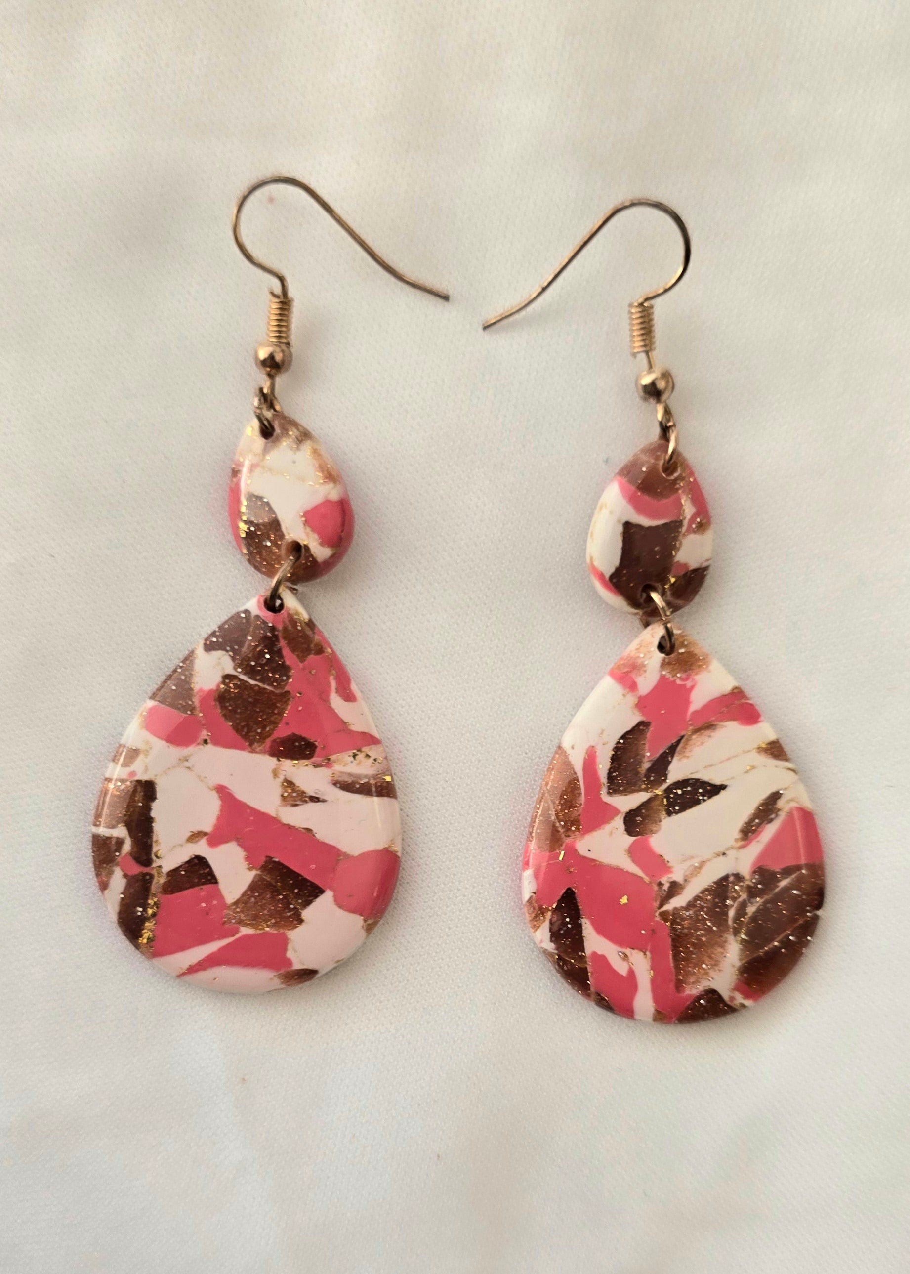 Shades of pink, white, and rose gold. These have the appearance of Rhodochrosite. Earrings are on a hypoallergenic gold-colored hook with a rubber backing. Earrings are made of polymer clay and have resin.