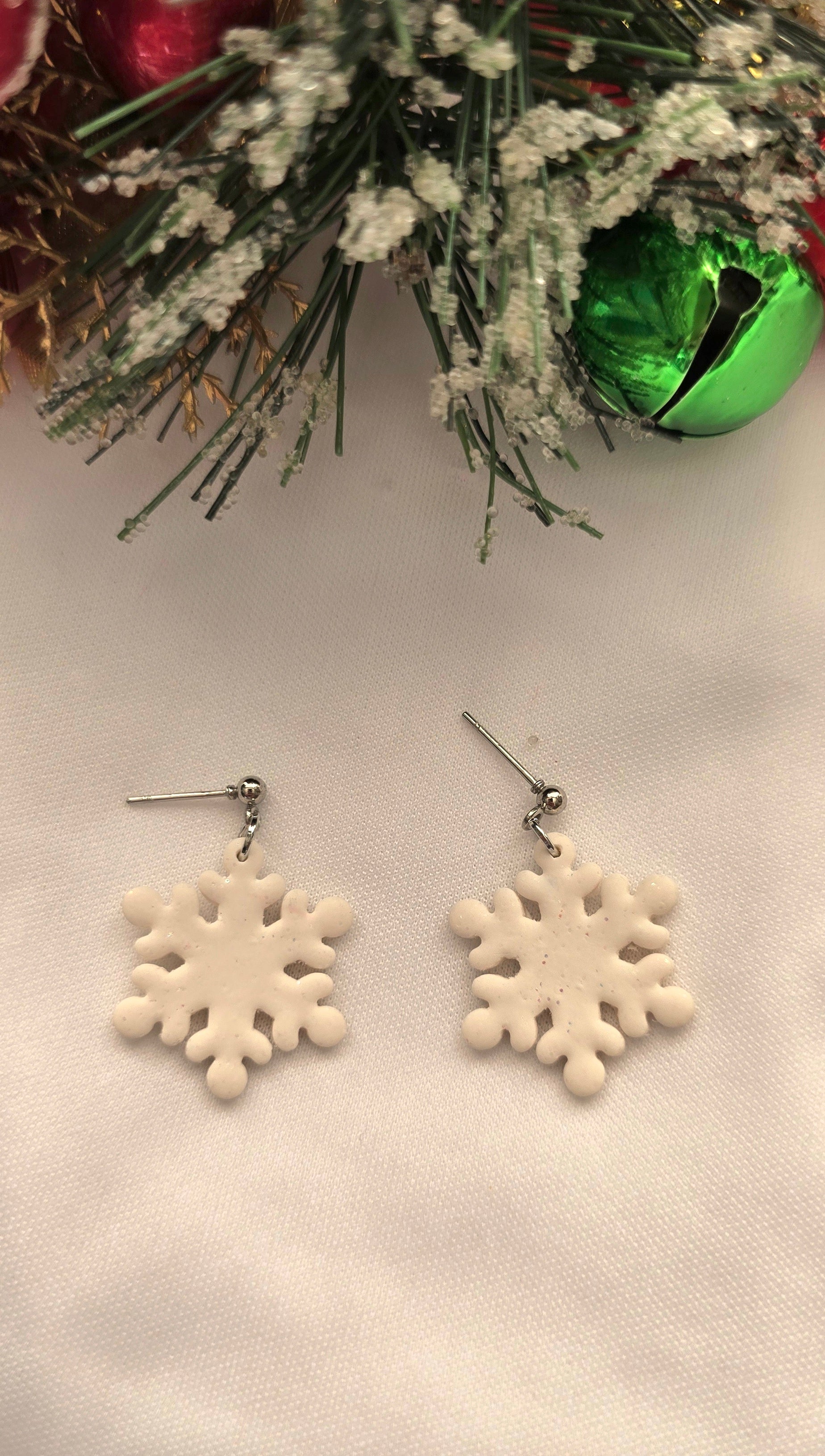 Beautiful sparkly white snowflakes! These come on hypoallergenic rhodium-plated stainless steel ball studs or hooks. Earrings are made of polymer clay.